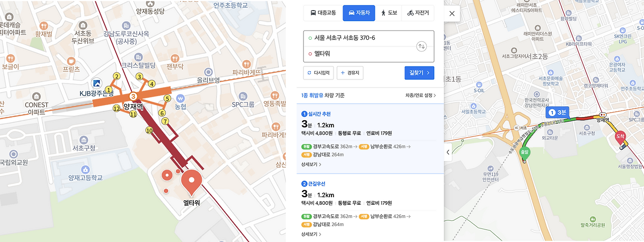 또한, 양재역은 서초IC에서 나오자마자 바로인 만큼, 서초IC로부터 엘타워까지는 채 5분도 걸리지 않습니다.