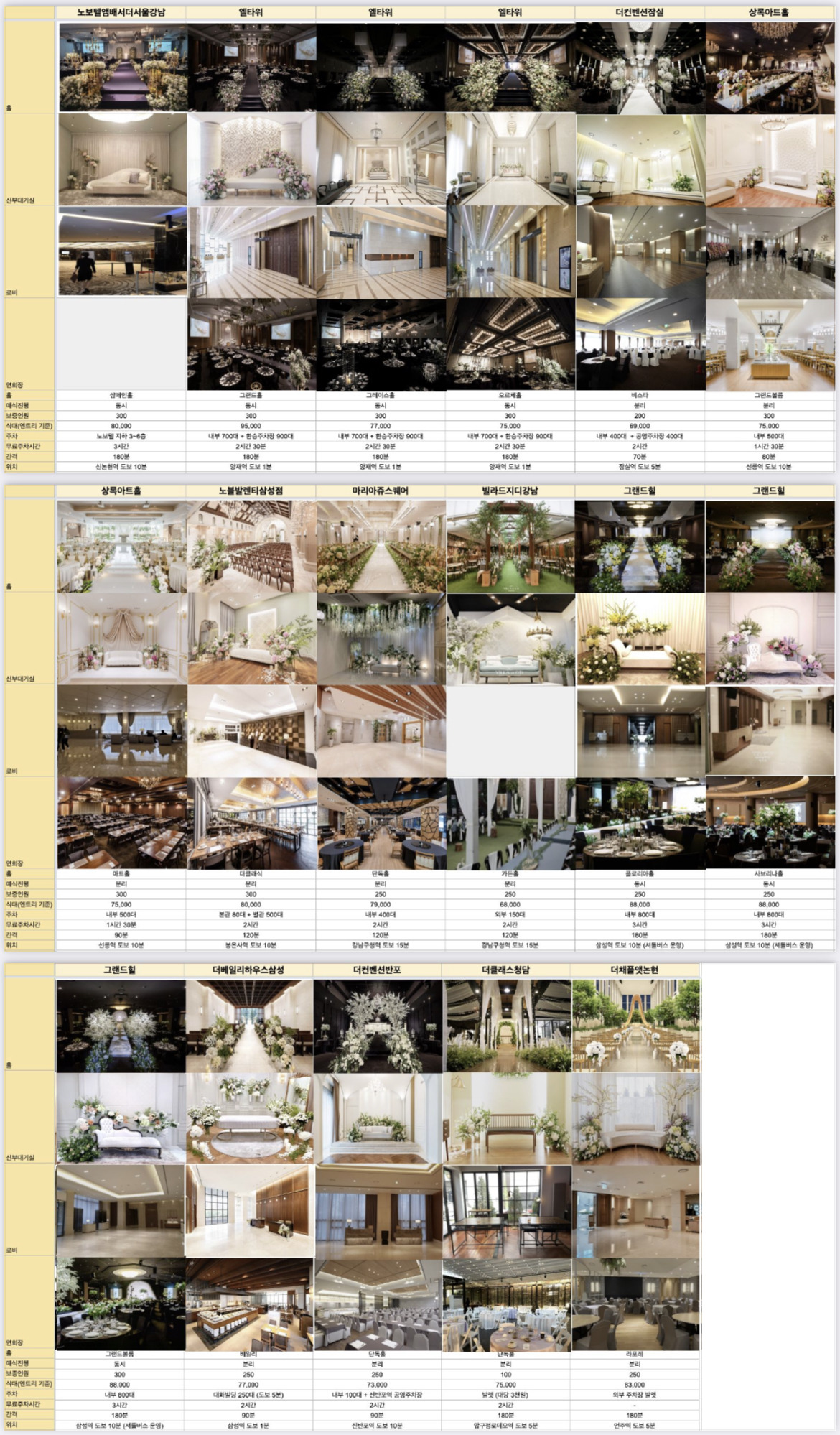 저는 우선 강남지역에 있는 결혼식장을 한 눈에 분위기를 비교할 수 있도록 정리를 했답니다.